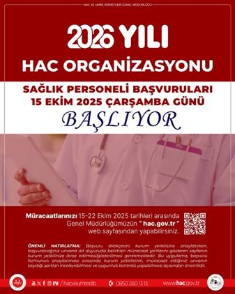 Diyanet İşleri Başkanlığı Hac ve Umre Hizmetleri Genel Müdürlüğü öncülüğünde yapılacak olan 2026 yılı hac organizasyonunda sağlık personeli olarak görev almak isteyenlere yönelik sağlık personeli müracaatları başladı. 2026 yılı hac organizasyonunda sağlık personeli olarak görev almak isteyenler için güncel müracaat şartlarına ve detaylı bilgilere Genel Müdürlüğümüzün http://hac.gov.tr web adresinden ulaşabilirsiniz. https://hacumre.diyanet.gov.tr/.../2026-y%C4%B1l%C4%B1... ÖNEMLİ HATIRLATMA Başvuru dilekçesini kurum yetkilisine onaylatırken, başvuracağınız unvana ait duyuruda belirtilen müracaat şartlarını gösteren sayfanın kurum yetkilinize ibraz edilmesi/gösterilmesi gerekmektedir. Bu uygulama, başvuru formunun onaylanması sırasında kurum yetkilisinin, müracaat ettiğiniz unvanın taşıdığı şartları inceleyebilmesi ve uygunluk kontrolü yapabilmesi açısından önemlidir.