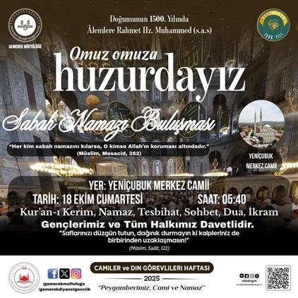 Değerli Halkımız, Peygamberimizin (s.a.s) doğumunun 1500. yılı olması hasebiyle “Doğumunun 1500. Yılında Alemlere Rahmet Hz. Muhammed (s.a.s)“ temalı etkinlikler kapsamında 18 Ekim 2025 Cumartesi günü, Yeniçubuk Merkez Camiinde “Sabah Namazı Buluşması” yapılacaktır.