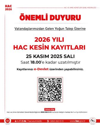 Vatandaşlarımızdan gelen yoğun talep üzerine 2026 yılı hac kesin kayıt işlemleri 25 Kasım 2025 Salı gününe kadar uzatılmıştır. Hac kayıt işlemlerinizi 25 Kasım 2025 Salı günü saat 18:00'e kadar e-Devlet üzerinden yapabilirsiniz. 2026 yılı hac kesin kayıt işlemlerinin nasıl yapılacağı ile ilgili "2026 Yılı Hac Kayıt Rehberi"ne Genel Müdürlüğümüzün http://hac.gov.tr web sayfasından ulaşabilirsiniz. https://hacumre.diyanet.gov.tr/.../2026-y%C4%B1l%C4%B1... Ayrıca hac kesin kayıt işlemleri ile ilgili detaylı bilgiye, Hac ve Umre Hizmetleri Genel Müdürlüğümüzün 0850 260 13 13 numaralı iletişim merkez numarasından veya il - ilçe müftülüklerimizden ulaşabilirsiniz.