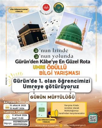 Başkanlığımızca, gençlerin milli ve manevi değerler ekseninde yetişmelerine katkı sağlamak, dinî ve ahlaki değerlerini diri tutmak amacıyla Üniversite ve Lise öğrencileri arasında ülke genelinde "Umre Ödüllü Gençlik Bilgi Yarışması" düzenlenecektir. Gürün'de hem Üniversite Kategorisinde1. olan öğrencimiz hem de lise Kategorisinde birinci olan öğrencimiz Müftülüğümüz himayesinde umreye götürülecek.